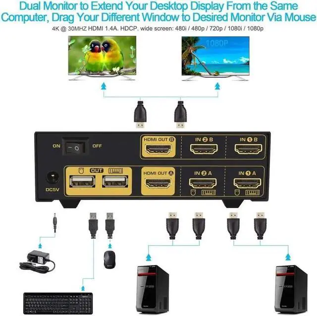 HDMI DUAL MONITOR??: Consoles control up to 2 computers or HDMI devices with 1 independent set of USB keyboard, mouse and 2 monitors extended/duplicated display with dual head input. The best KVM Switch to make your work space tidy and efficient. Please be aware of the adapters you may need for your set-up.?? USB