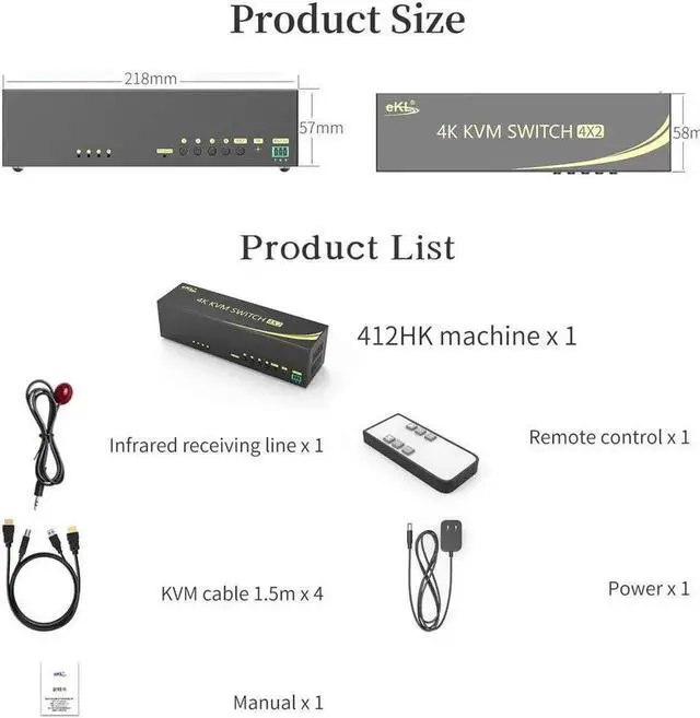 Description: 4 Port Dual Monitor HDMI KVM Switch Extended Display, 4 computers or Laptops sharing with one set of keyboard, mouse and 2 monitors which supports dual monitor extended display or duplication; Each computer and laptop need to have 2 video output interfaces and support extended display. Support Dual HDMI or HDMI + VGA / DVI / DisplayPort Computers & Laptops (Need Adapters, Not Included), Please be aware of this before purchasing. (dual HDMI input is the best, not suggest to use convertor, if the convertor is not good quality, it may lead to not display or reduce the resolution) Convenient switch modes, 1. Hot key switching on keyboards that support all operation system; 2. Switch via Mouse Click switch; 3. Button swith on front panel; 4. Auto scan switch with adjustable interval (8-999 second). 5, RS232 code switch. Plug and play with no driver needed, include all cables and DC 5V/1A power adapter, with extra USB 2.0 ports for sharing USB printers, scanners and so on. Supports up to 4K @60Hz 4:4: 4, built-in Auto EDID, supports separate audio input and output. anti interference metal design to ensure sturdiness.