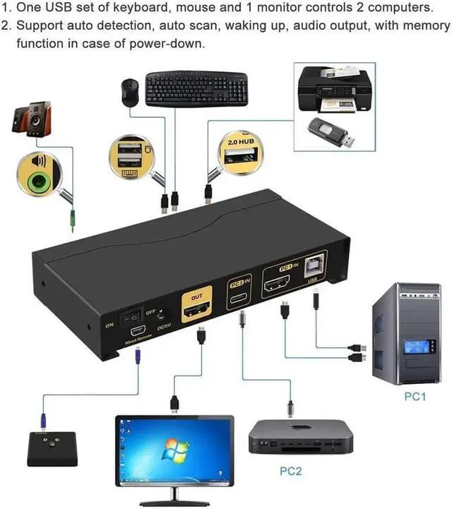 • 1. KVM Switches: 1 USB-C input & 1 HDMI input, 1 HDMI output. 2 computers / Mac / laptops / mobile phones sharing one set of keyboard, mouse, 1 monitor and 1 USB 2.0 peripheral. With 3.5mm stereo audio output and all input port cables. Compatible thunderbolt 3.