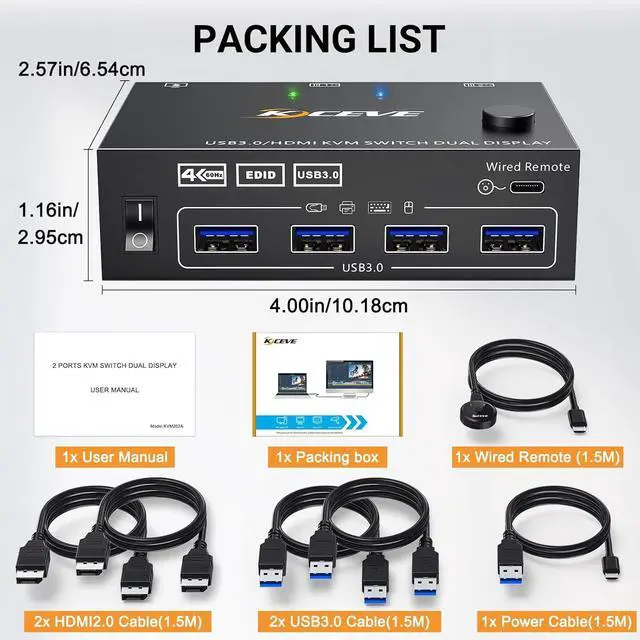 USB 3.0 version KVM HDMI switch for 2 computers 2 monitors Easy set up for HDMI devices, 2 HDMI ports are requird for your each computer Support 2 display modes Enjoy HD quality display, support follow resolution USB 3.0 KVM Switch with EDID emulators in each input port Support 2 switching ways Physical button control Wired control DC5V port for power supply