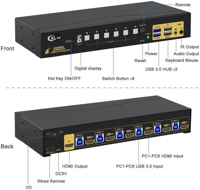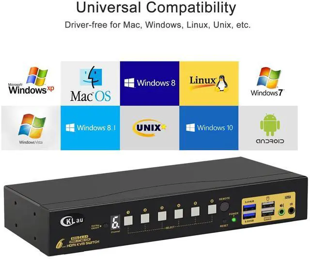 Keyboard SwitchingThe default hotkey key is the right CTRL. Switching operates: Num Lock + Num Lock + 1 / 2 + ... Enter, or Ctrl + Ctrl + 1 / 2 + ... + Enter, or Scroll Lock+ Scroll Lock+1 / 2 + ... + EnterMouse SwitchingClick the mouse wheel 2 times + left button / right button, and then it will switch to another computer.Manual Button SwitchingYou can press the button one time, then it will switch to that computer.Wired Remote SwitchingYou can press the button of the wired remote one time, it will switch to that computer.IR Remote SwitchingYou can press the button of the IR sender, it will switch to that computer. CKLau 6 In 1 Out HDMI KVM Switch Supports Hotkey Function CKLau 16x1 USB 3.0 KVM Switch System Diagram CKLau USB KVM Switch 6 Computers Supports Emulation EDID This KVM USB HDMI Switch More Adv