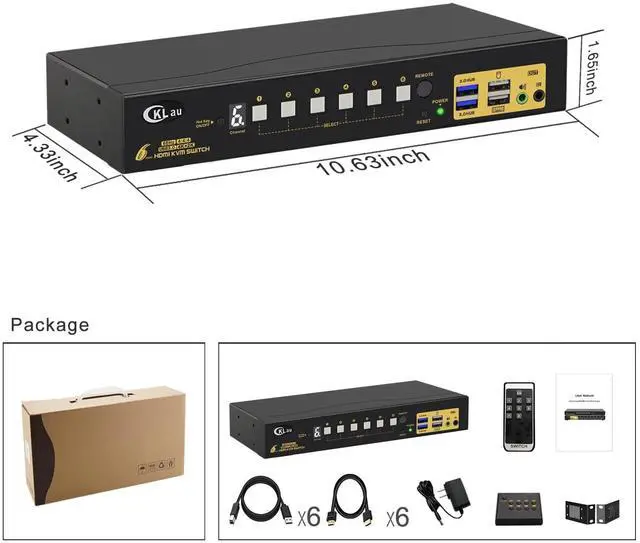 1 x 6 Port KVM switch + 6 x HDMI Cables + 6 x USB 3.0 cable + 1 x DC 5V 2A Power adapter + 1 x IR remote controller + 1 x User manual + 1 x wired remote push button + 2 x rack mount hook