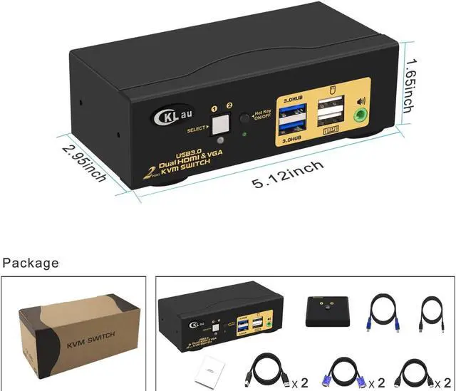 Package: 1 x 2 Port HDMI VGA KVM Switch + 2 x HDMI cable + 2 x VGA cable + 2 x USB 3.0 cable + 1 x User Manual + 1 x DC 5V 2A Power Adapter + 1 x wire remote push button switch