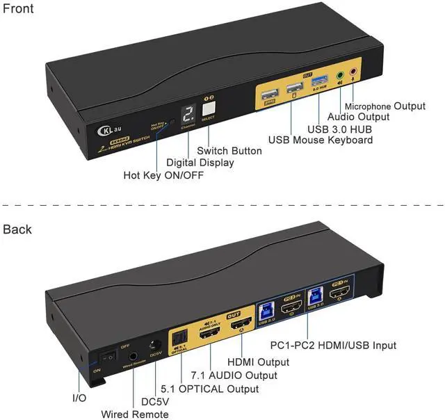 CKLau 2 Port HDMI KVM Switch 1 Monitor 8K@60Hz 4K@144Hz with Cables Supports Emulation EDID, Hotkey Switching, 5.1 Optical and 7.1 Audio via HDMI Optical 5.1 Audio and 7.1 Audio Via HDMI USB 3.0 HUB Hokey On/off button and LED display Support 3.5mm Audio port and microphone for easy assist Installation Step: Helpful Tips for Using Your KVM Switch