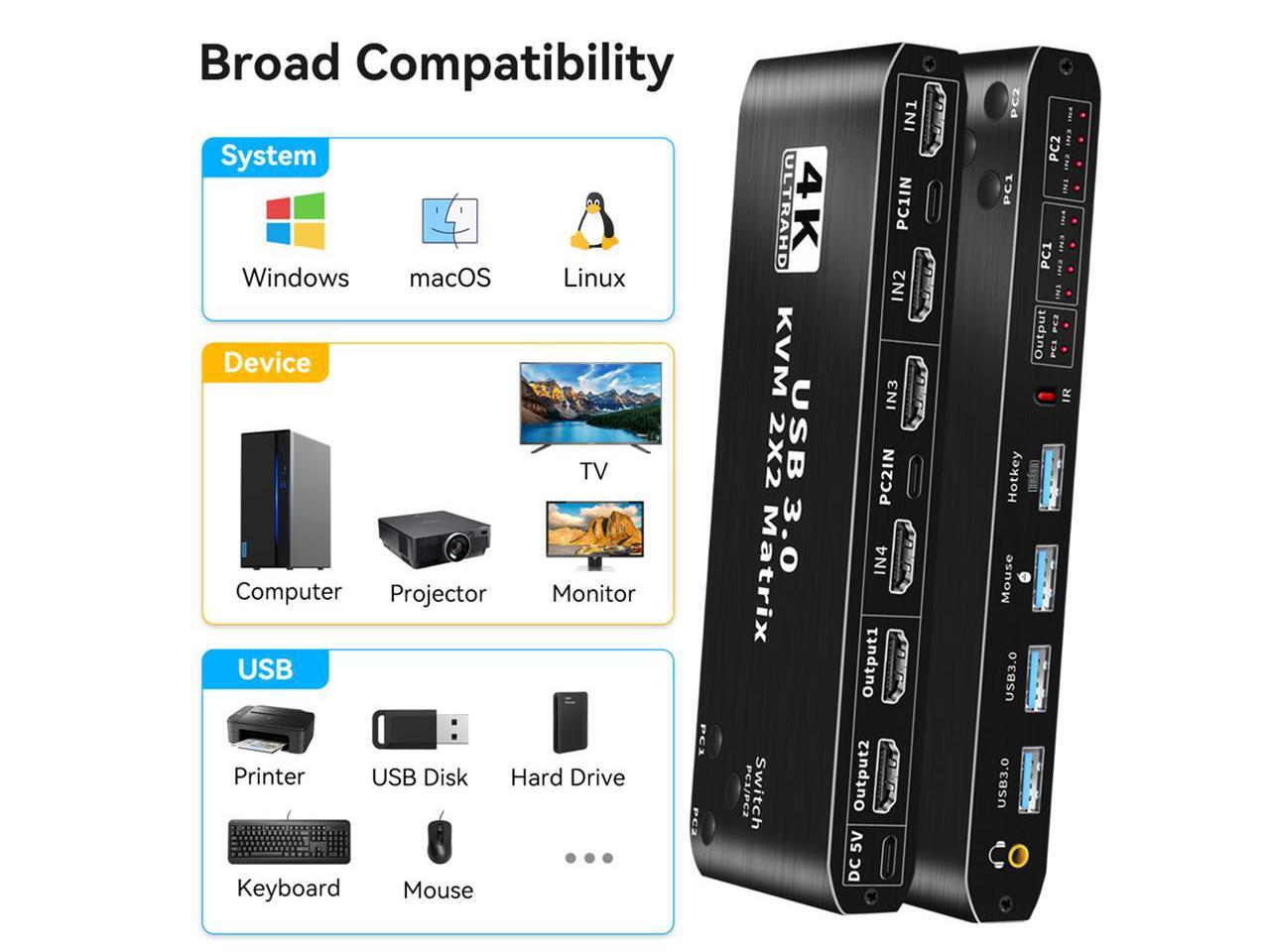 - [Dual HDMI KVM Switch with USB 3.0 Port]- Supports Connecting your USB 3.0 port device such as Scanner/USB driver/3D Printer/Monitor Camera