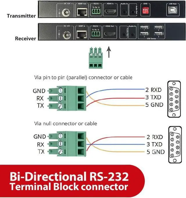 No video loss, no time delay, with one way PoE(from transmitter to receiver), RS232 pass through over HDBaseT; DIP switch for EDID management; USB 2.0 pass through,1 x USB-Host connector built in transmitter and 4 x USB-Devices connector built in receiver;
