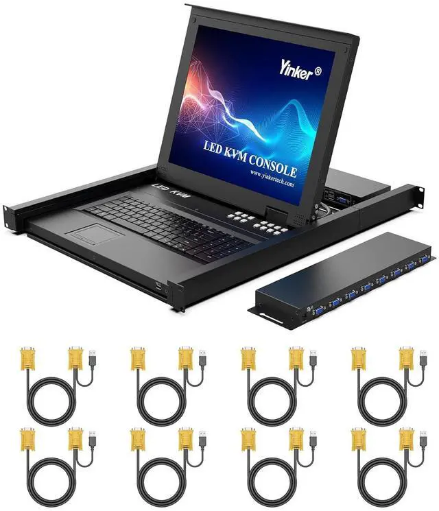 LCD KVM Switch VGA, can manage 8 computers or servers with the integrated 17'' LCD monitor US keyboard and touchpad.