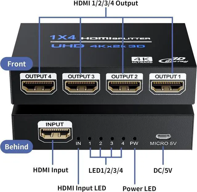 Compatible: Powered HDMI splitters 4 port is compatible for Computer, X box, PS3/ PS4/ PS5, Fire Stick, Blu-Ray DVD Player, PC etc.