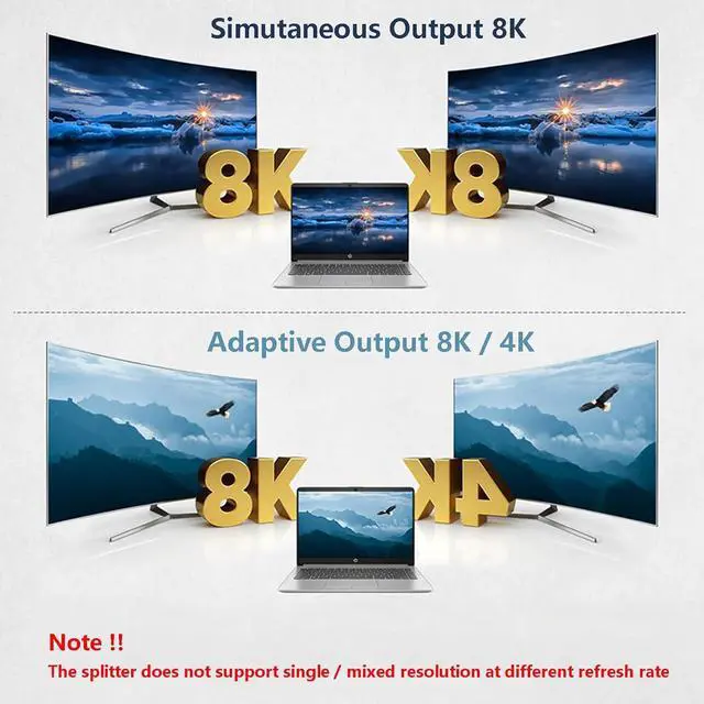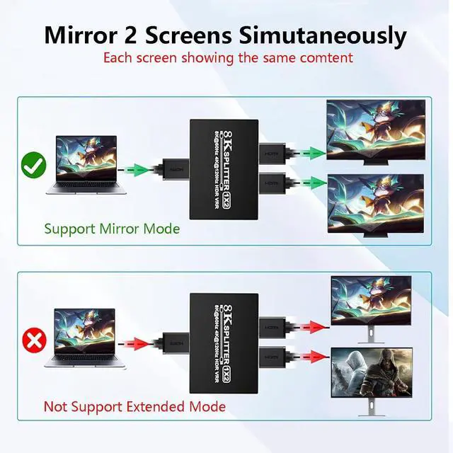 - Kindly Note: 1. The HDMI splitter only support Mirror Mode, Not extend mode; 2. The splitter is not a MST hub; 3. Pls power the splitter with 5V USB charger ( not included ), do not use usb charger of multi-voltage; 4. Pls use HDMI ATC certified ultra high speed hdmi 2.1 cable