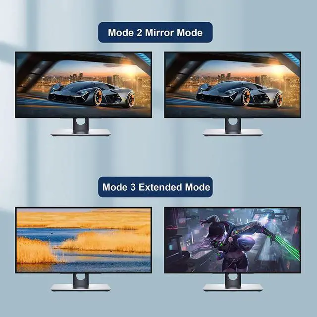 Note: Only when your computer supports dual display, you can use this KVM to achieve two computers to share two monitors, extended mode or copy mode. If your computer only supports single display, then this dual monitor kvm switch cannot help you get dual display function.