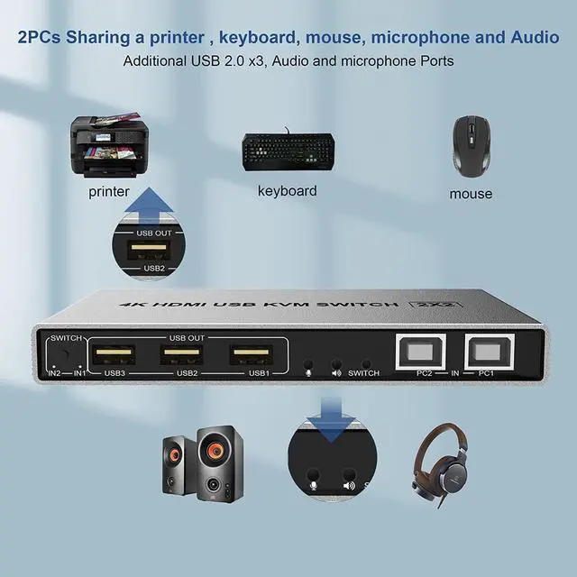Dual Monitor KVM Switch HDMI 2 Port, 4K@60Hz Extended Display 2 Monitors 2 Computers KVM Switch with 3 USB Ports and Audio Microphone Output, PC Monitor Keyboard Mouse Printer Switcher