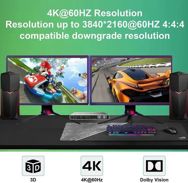 • Ultra HD 4K@60Hz KVM Switch Dual Monitor 4K KVM switch support up to 3840x2160@60Hz RGB 4:4:4 and downward compatible. Support 3D, HDR, HDCP, and Dolby Vision make the image display more exquisite and authentic, the color will be vivid and moving. Note: Only when both your computer Graphics card and monitor support 4K@60Hz then you can get 4K@60Hz effect, so if you want the max resolution you have to check your devices first.