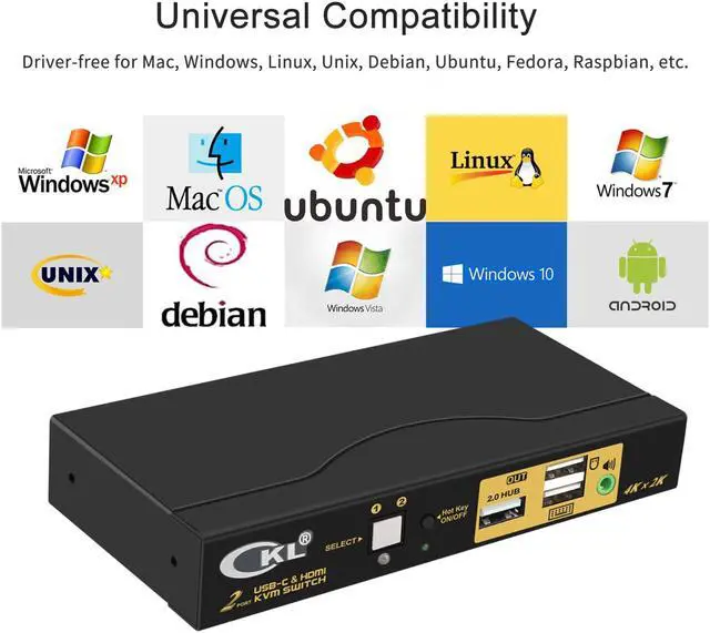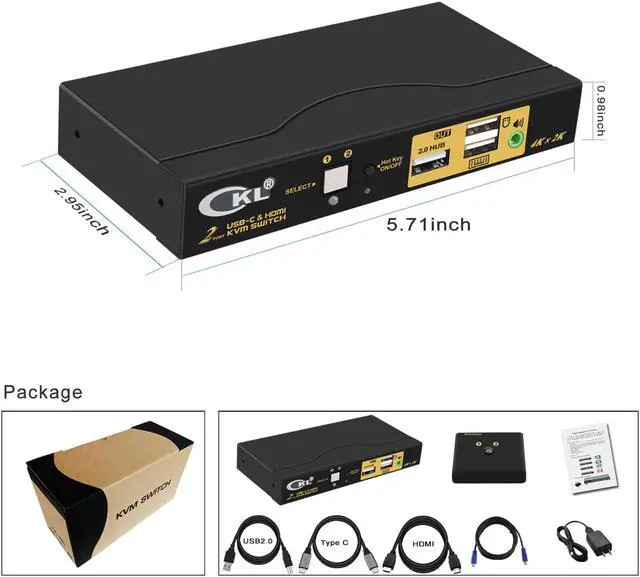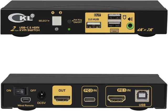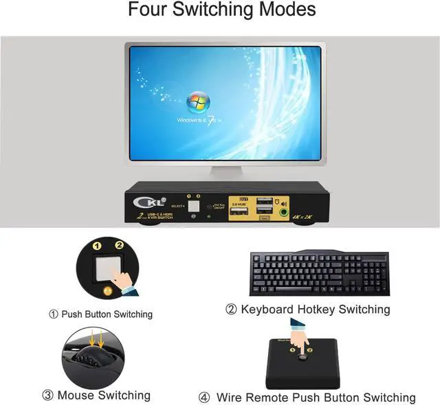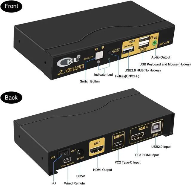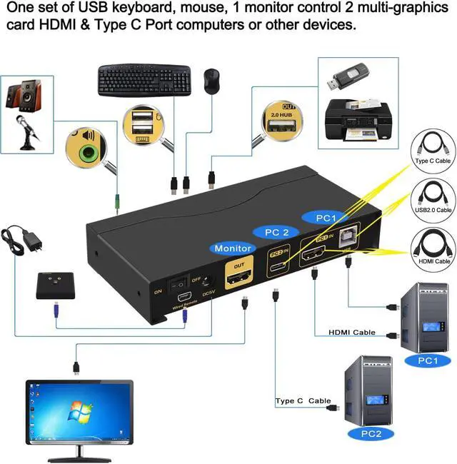 USB TYPE C: Controls 2 computers or laptops using 1 set of wired or wireless keyboard, mouse and monitor. For one computer using HDMI input, another using USB Type C input, monitor output using HDMI;