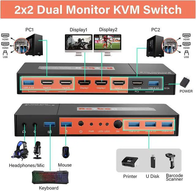 4.Highly recommend using a source with dual HD-MI ports for use with this KVM Switch, otherwise, that need VGA/DVI/ DP to HD-MI convertor or docking station.