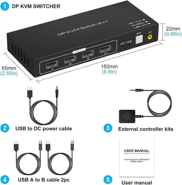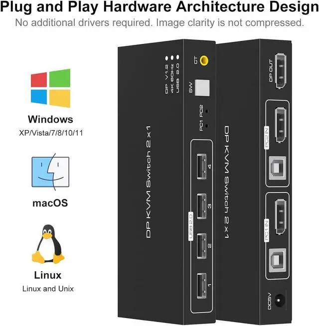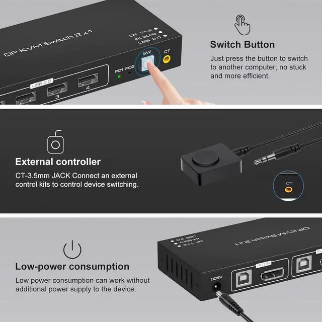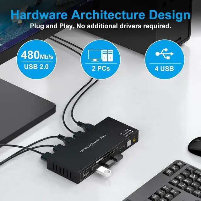The KVM Switch DP Support One-Key SwitchingJust Need to Lightly Press The Button on The Panel,You Can Easily and Quickly Switch Between 2 Computers