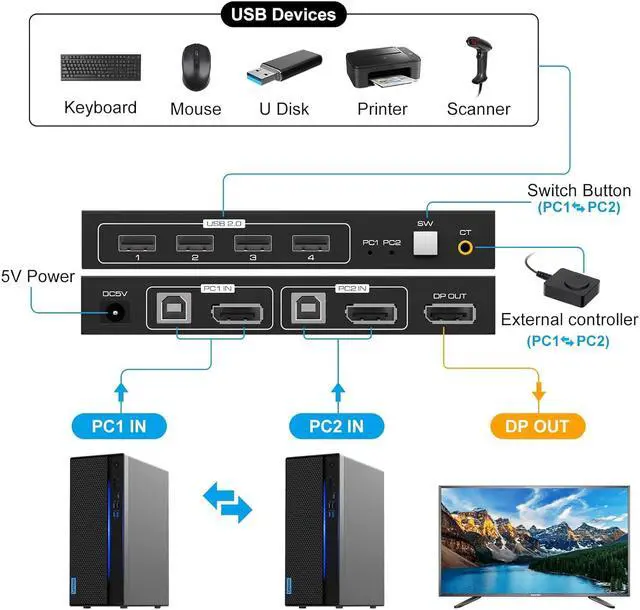 The Kvm Switch Displayport Support 2 Computers Share 1 HD Monitor (such as TVs, Projectors, LCD Monitors, Etc.)and Just Need 1 Keyboard and Mouse.