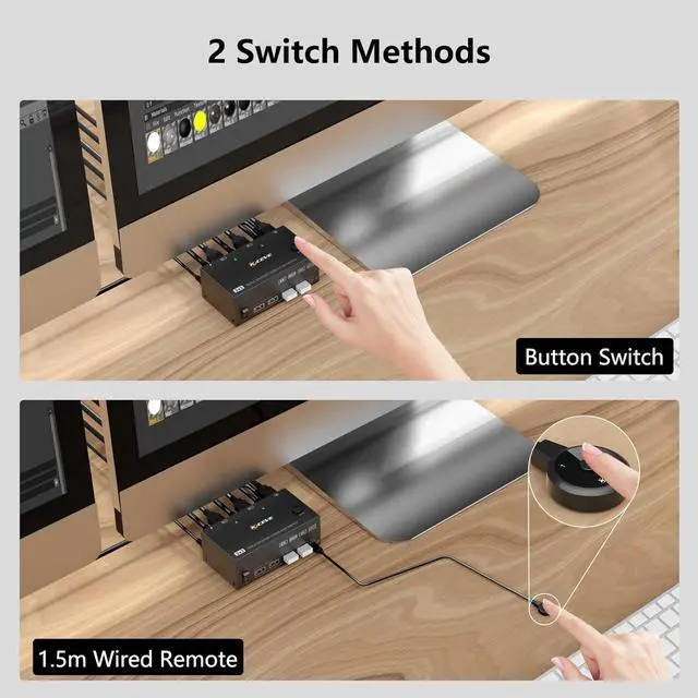 [2 Switching Methods] Freely switch between 2 PCs using the KVM switch button or the 1.5m wired remote control.