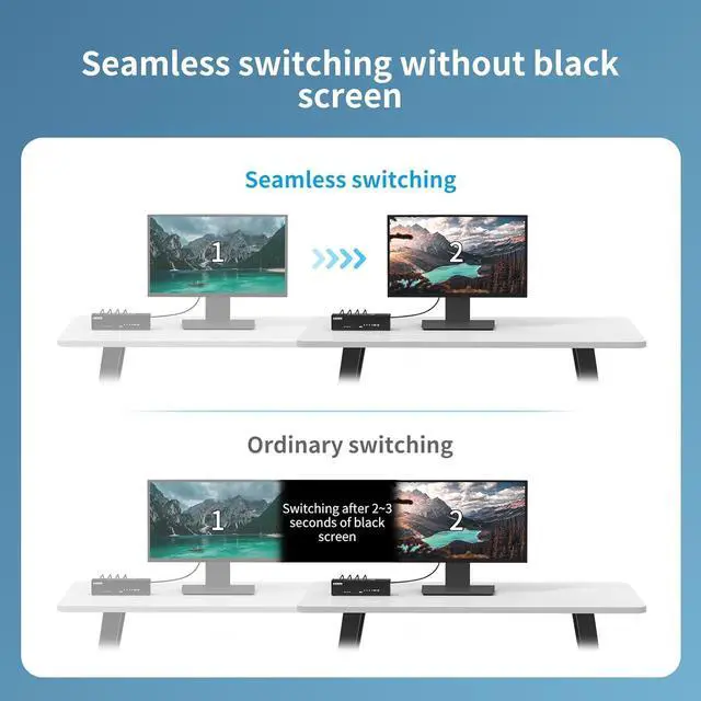 Multiple switching modes: keyboard Hotkey, mouse clicks, push button, RS232 code and remote control;
