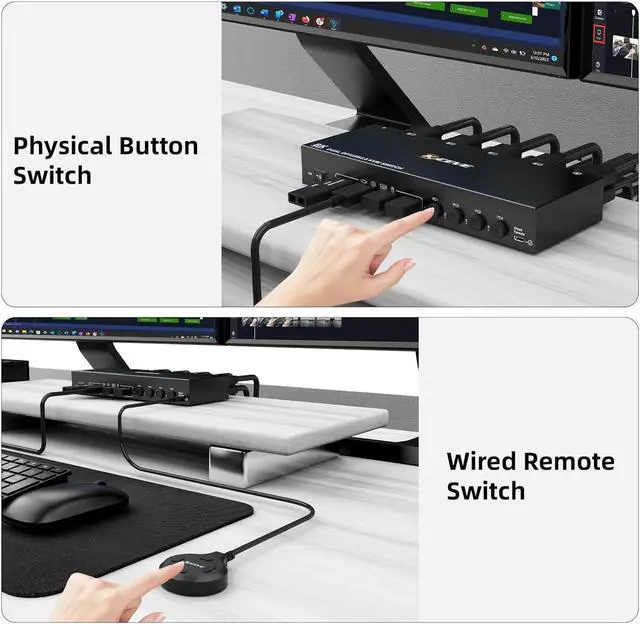 With the included 1.5M desktop controller, you can easily switch signal when the 4 port dual monitor kvm is placed behind or under a desk.