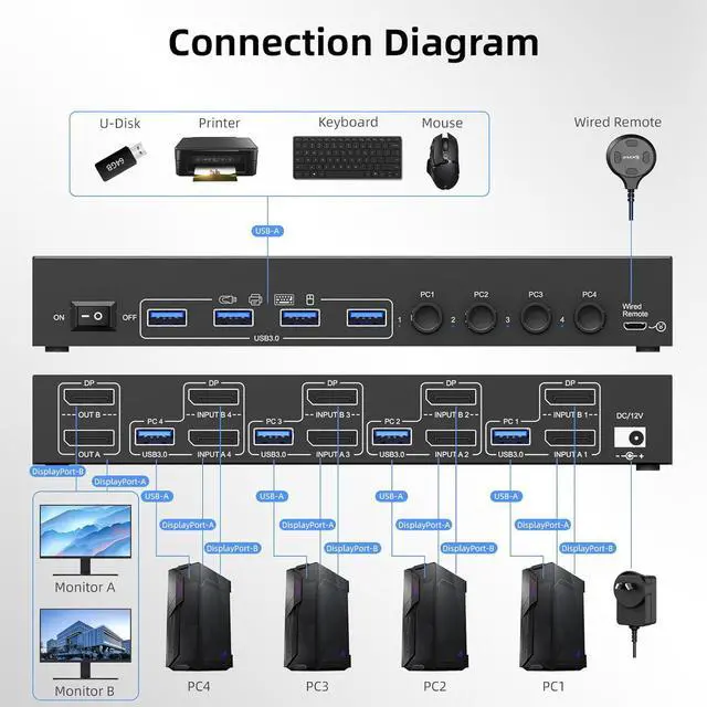 When you want to turn off dual monitor DP 1.4 kvm, just one-click here to free from the hassle of the unplugging and unplugging the cables.