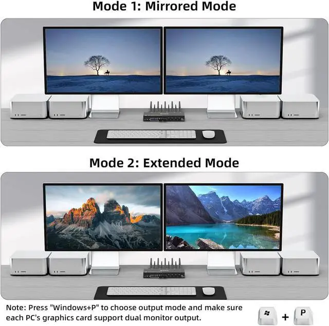 2 Working Modes of 4 Computers Dual Monitor DP 1.4 KVM Switch