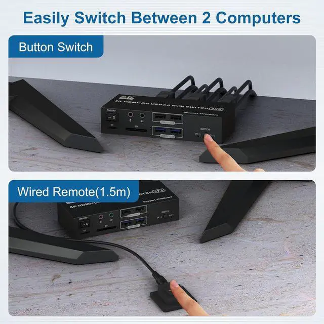 - This Dual monitor HDMI Displayport KVM switch equipped with HDMI Displayport inputs and outputs, allowing you to connect and control two computers across two hdmi monitors. Experience stunning visual clarity with support for resolutions up to 8K60Hz 4K120Hz.