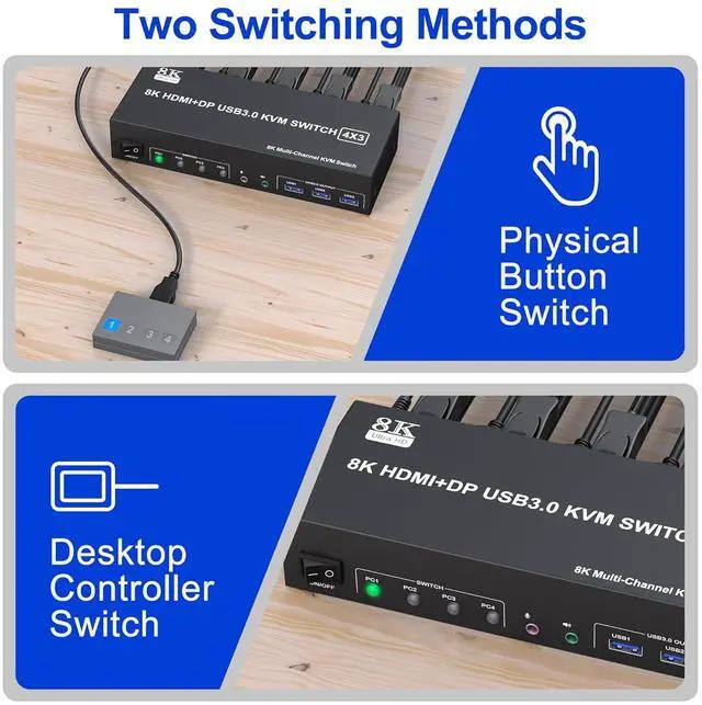 1. 8K Triple Monitor KVM Switch 4-Port allows 4 computers/laptops share one set of keyboard, mouse, and 3 monitors (2 HDMI + 1 DisplayPort)