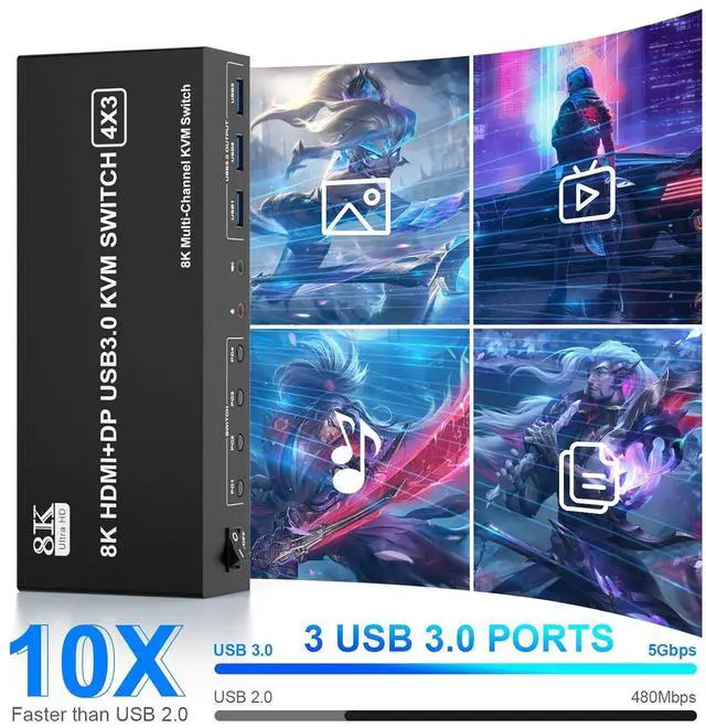 8K@60Hz 4K@144Hz 2 HDMI + 1 DisplayPort USB 3.0 Triple Monitor KVM Switch for 4 Computer Sharing 3 Monitor and 3 USB 3.0 Ports, Audio & Microphone