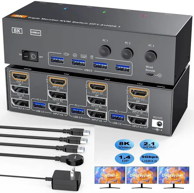 The resolution and fresh rate of triple monitor KVM switch supports up to 8K@60Hz/4K@144Hz.