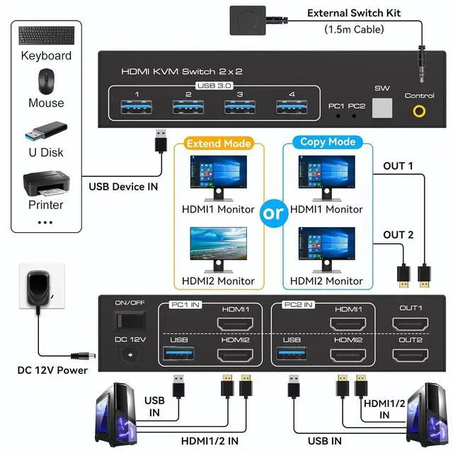 This hdmi kvm switches allows you to control 2 computers with one set of keyboard and mouse, sharing 2 monitors and 4 USB 3.0 devices, supports duplicate and extended modes.