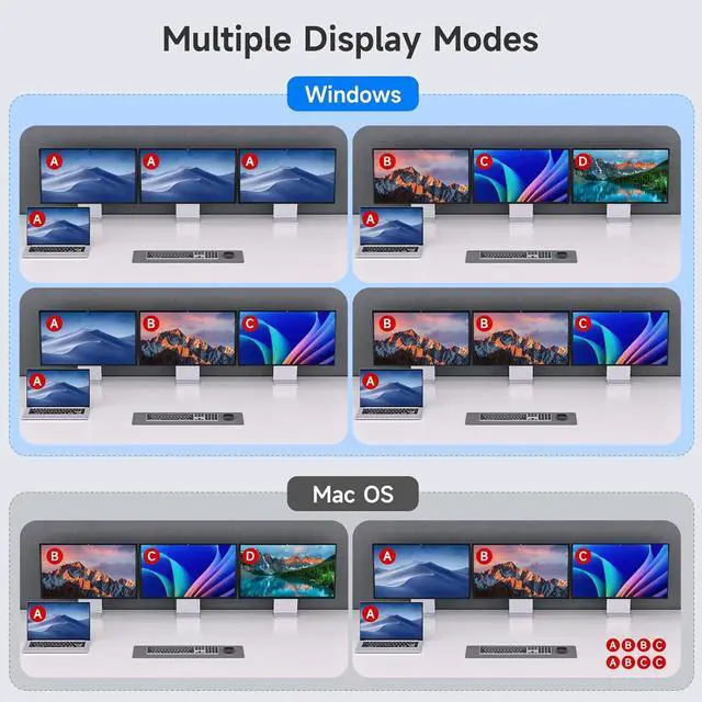 A: This 3 monitors USB C KVM switch supports simultaneous output of 3 external monitors, 1* 4K@60Hz +2* 1080P@60Hz , and supports mirror and expansion mode output.