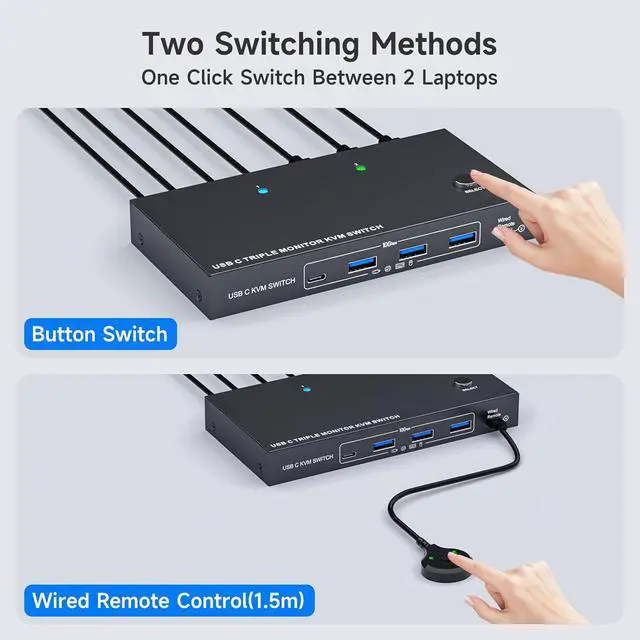 With The USB C 3 monitors KVM switch, you can switch between 2 laptops to share 3 HDMI external displays and 4 USB 3.2 ports.