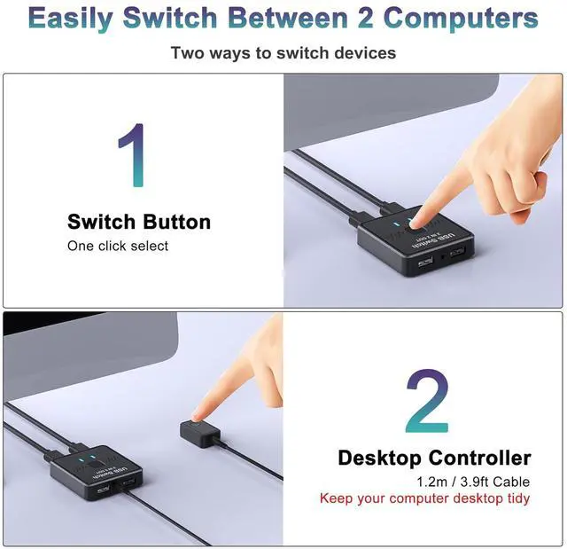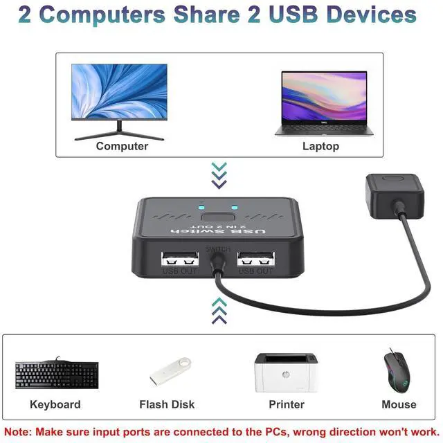 | Application | 2 in 2 out USB switch supports 2 computers sharing 2 USB devices like keyboards, mouses, printers, webcam and more. Switch freely between your work computer and personal laptop, boost your work efficiency. ( Not a KVM switch and does not support a monitor or video transmission.) |