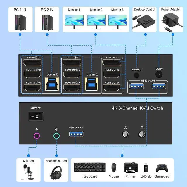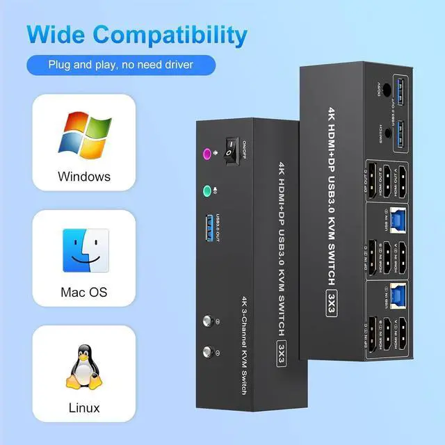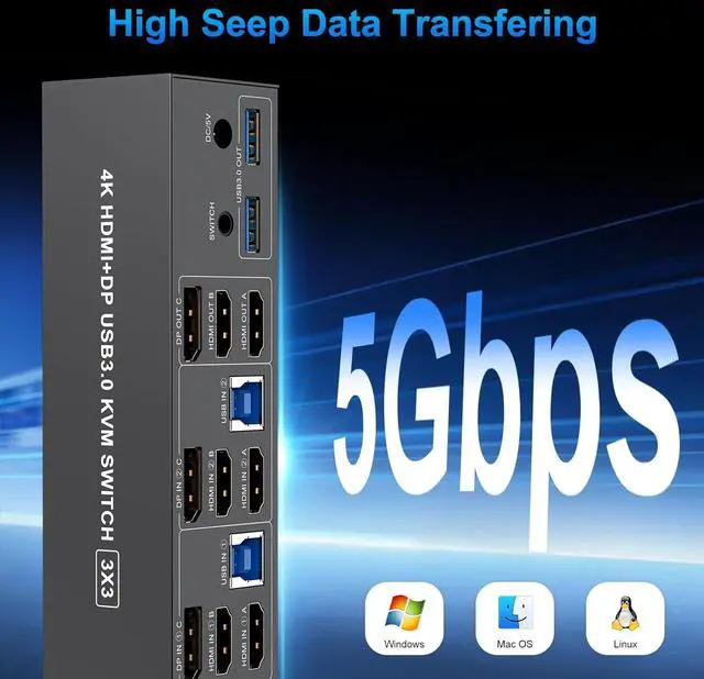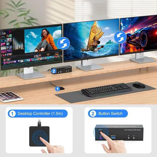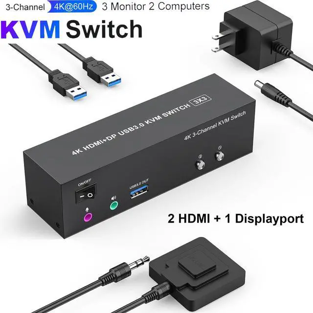 | Video Resolution | 3 monitor KVM switch supports up to 3840*2160@60Hz and is backward compatible with 3D, 1080p and below. Support HDMI2.0 and DP1.2 standard, HDCP2.2 ,maximum data rate HDMI 18Gbps/ DP 21.6Gbps. (Note:To achieve the highest resolution, you must ensure that both the source and the monitor, as well as the HDMI and DP cable , support 4K@60Hz) |