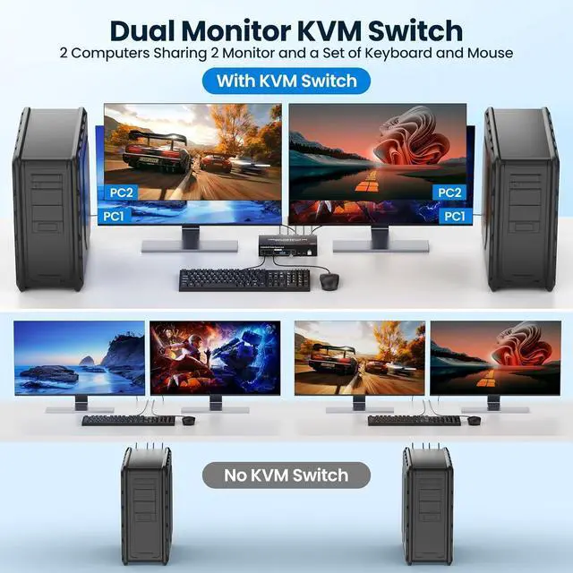 This KVM switcher 2 computers 2 monitors is widely compatible with Windows, Mac OS, Linux, and other PC systems. Perfect for home offices, gaming setups, and professional environments.