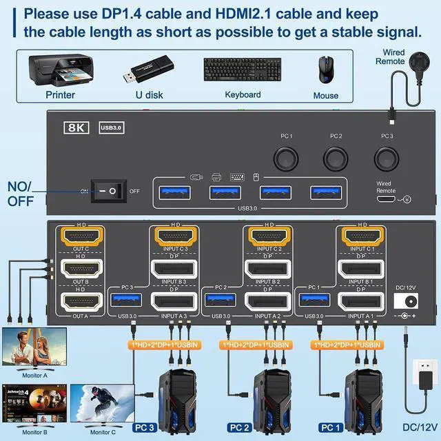 HDMI + 2 Displayport KVM Switch for 3 Monitor 3 Computers (3 HDMI OUTPUT)