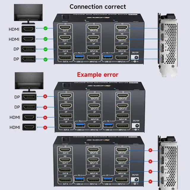Each PC needs 1 USB +2 DP+2 HDMI cable connected to this quad monitor KVM switch to achieve 4 monitors output.Supports mirror mode and extended mode,Only supports desktop PCs with dedicated graphics cards and Android operating systems; laptops are not supported.