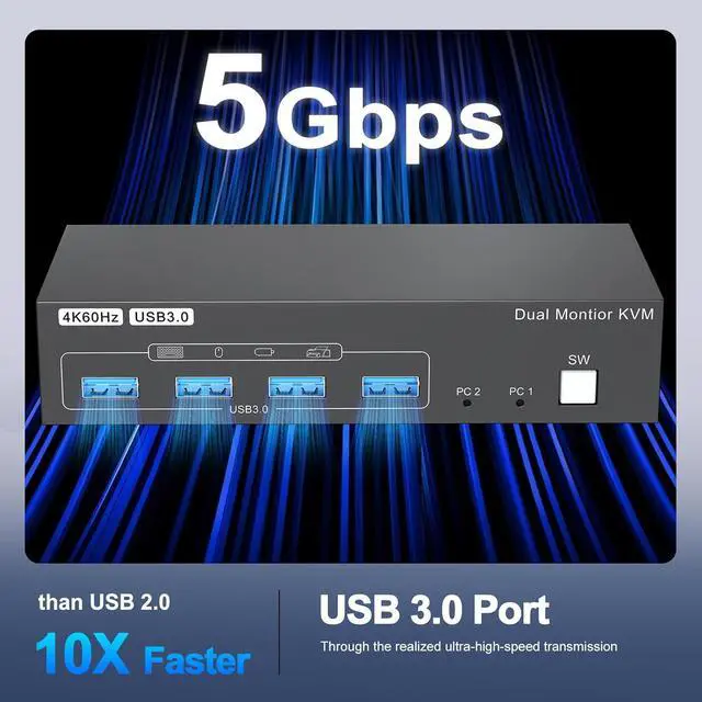 - USB 3.0 KVM Switch:HDMI display port KVM switch dual monitor with 4 USB 3.0 ports, can recognize mouse, keyboard, printer, U disk and other USB peripherals. USB 3.0 can provide up to 5Gbps transmission speed, which is 10 times faster than USB 2.0, and has obvious advantages when reading U disk or hard disk. At the same time, the switch is compatible with USB2.0 devices.