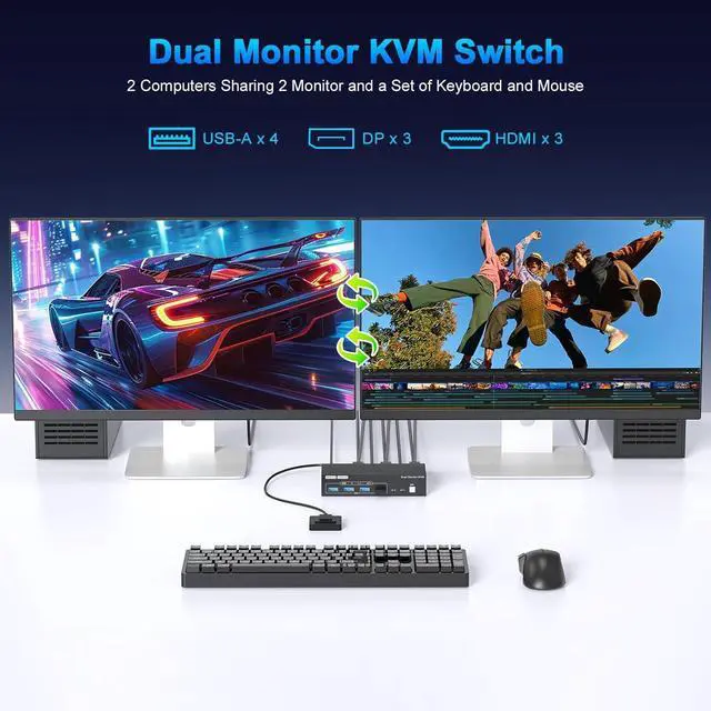 - Dual Monitor KVM Switch: KVM switch 2 ports allows two computers or laptops to share two HD monitors and 4 USB 3.0 ports, such as mouse, keyboard, printer U disk or gamepad, etc. It also support extended and copy mode display, if your computer support dual monitor display and have extended or copy function. Please note: The computer and monitor to be used need to come with an HDMI port and a DP port, and the use of HDMI to DP and DP to HDMI conversion cables is not supported.