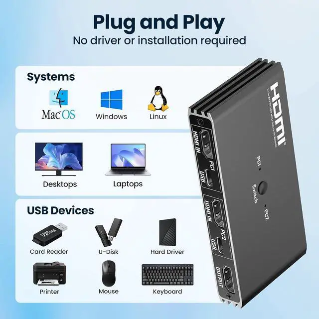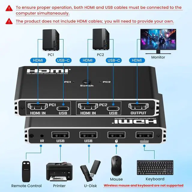 KVM Switch 1 Monitor 2 ComputersThe KVM Switch support 2 computers/laptops share 1 monitor and one set of wired or wireless keyboard mouse and other USB devices. For optimal performance, connect both HDMI cables and USB cables simultaneously.