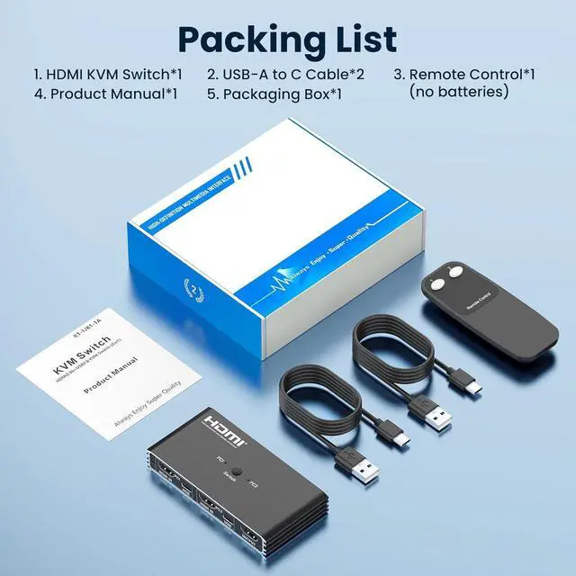 1* KVM Switch, 2* USB 2.0 Cable, 1* Product Manual,1*Remote Control (no batteries).