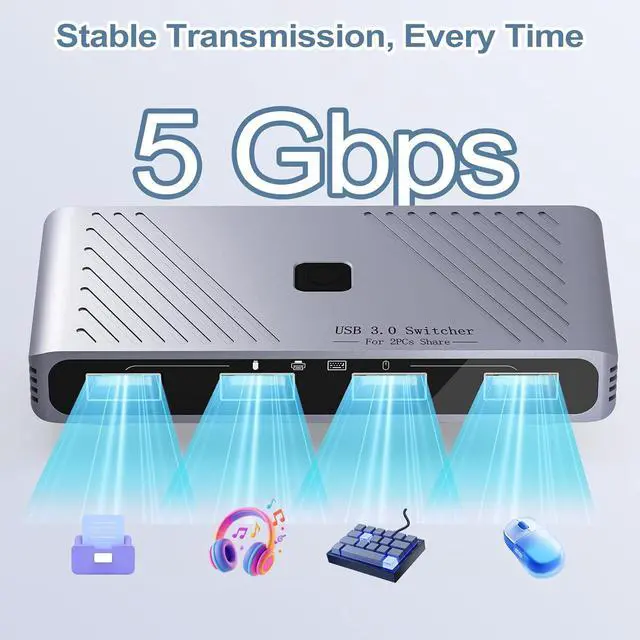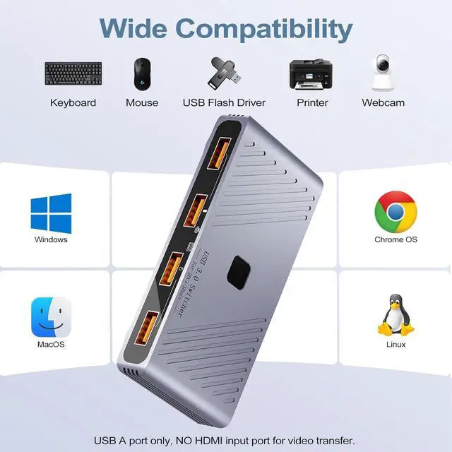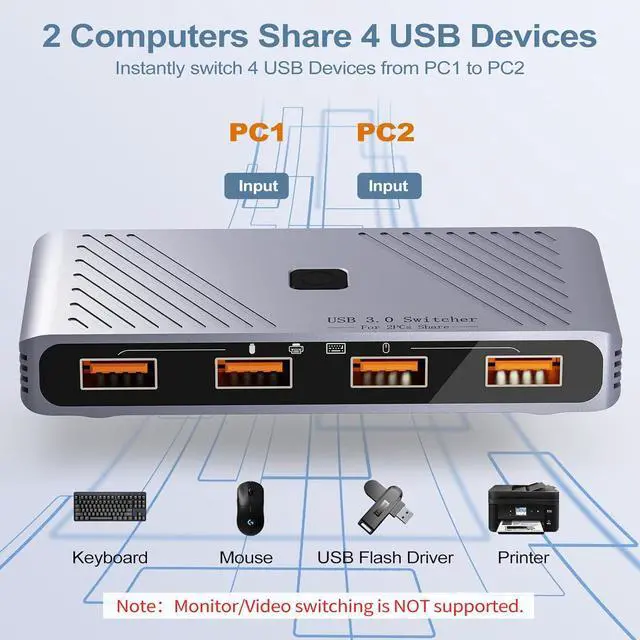Share 4 USB Devices Between 2 Computers: This USB 3.0 switch lets two PCs or laptops share four USB-A peripherals like a keyboard, mouse, printer, and scanner. Instantly switch control between your work and personal computer with one button press