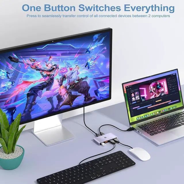 Simple One-Button Operation & Plug and Play: Switch all connected USB devices between two computers instantly by pressing the button on the hub. No software needed. Works seamlessly with Windows and Mac OS systems right out of the box