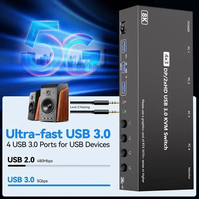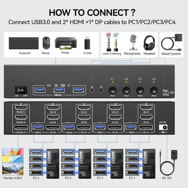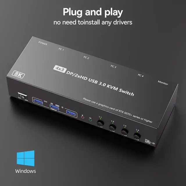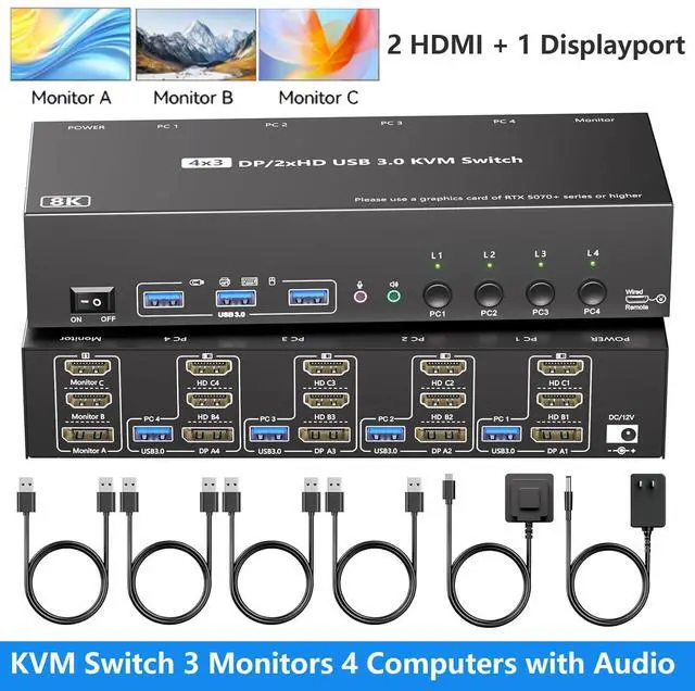This 2 HDMI + Displayport triple monitor KVM switch is perfect for 4 computers to share 3 monitors and 4 USB 3.0 devices.