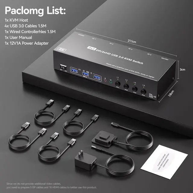 Note: Please connect the 12V DC power adapter to provide sufficient power. Using a shorter 8K HDMI + DP cable can make the KVM switch more stable.