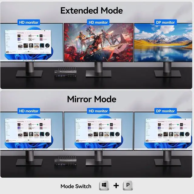 This kvm switch supports extended mode (three screens display different contents), and duplicate mode (the three screens display the same contents)