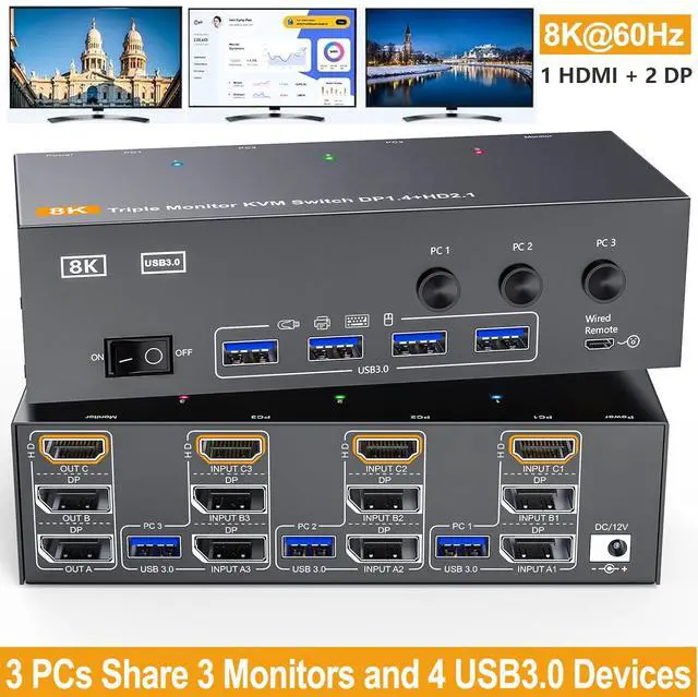 The resolution and fresh rate of triple monitor KVM switch supports up to 8K@60Hz/4K@144Hz.