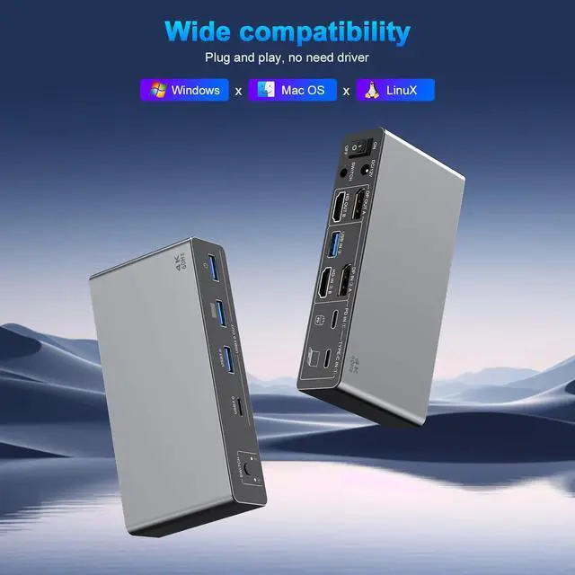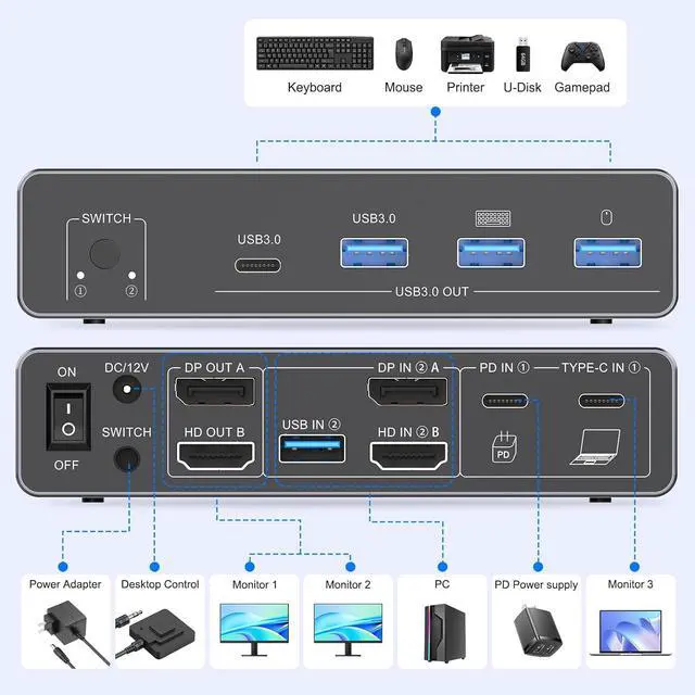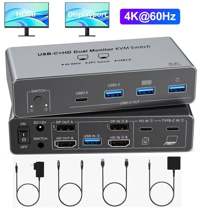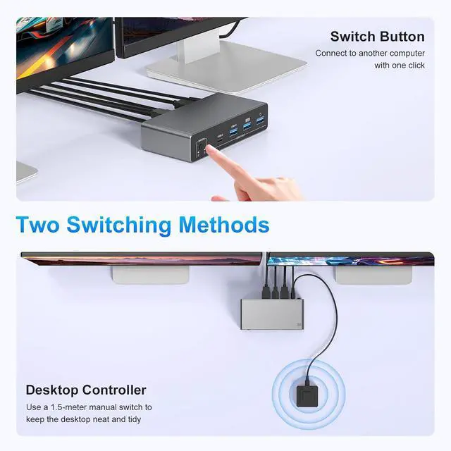 | Application | KVM switch 2 monitors 2 computers built with 1x USB-C (MST) input port for laptop, and 1x integrated HDMI +Displayport+ USB-A input port for desktop. Allows you to effortlessly manage 1 Laptop and 1 Desktop to share 2 monitors and 4 USB devices together.Switch easily between your work PC and personal laptop. |