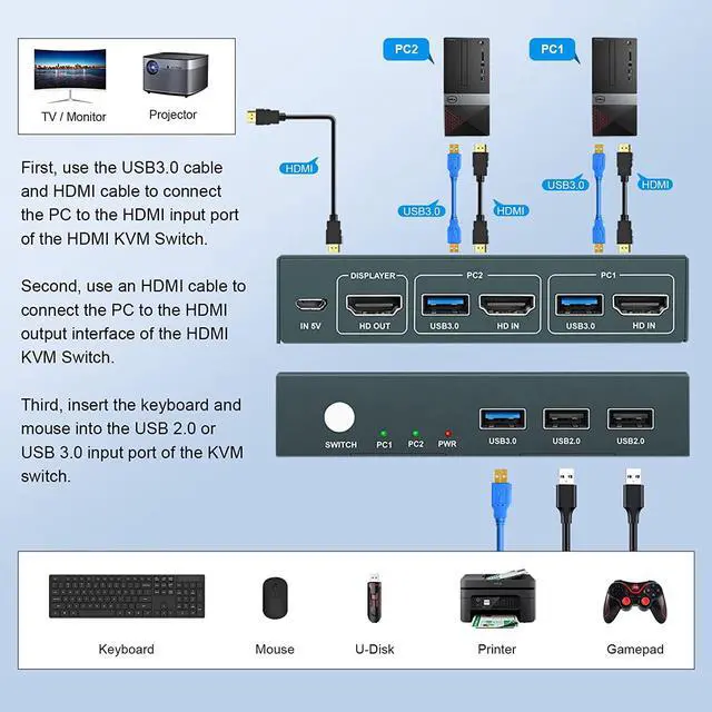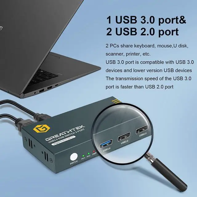 [USB 3.0 Protocol Support] This KVM switch is equipped with 1 USB 3.0 port and 2 USB 2.0 ports that can reach a maximum data transfer rate of 18Gbps, which allows for faster read speeds when sharing devices such as printers, cameras, scanners, or USB drives between 2 computers, which will improve your work efficiency. haring devices such as printers, cameras, scanners, or USB drives between 2 computers, which can better improve your work efficiency.