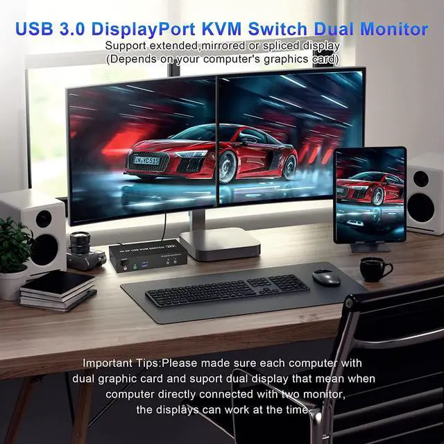 Dual Monitor KVM Switch Displayport: The dual monitor kvm using only 1 set of keyboard, mouse and 2 monitors to control 2 DisplayPort computers/laptops, Support up to 4K@60Hz for extended, mirrored or spliced displayDepends on your computer' s graphics card). Make your work space tidy and efficient, also a premium choice for working from home.